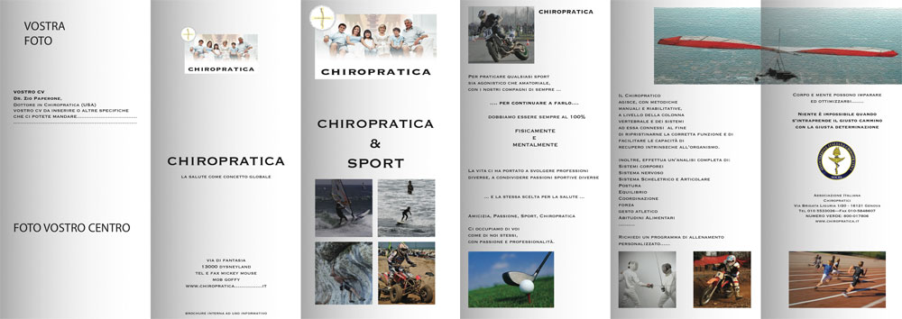 Perché la chiropratica è di estrema utilità sia per gli atleti che per gli sportivi amatori, oltre che per i nostri figli che praticano sport. Nella brochure ci sono fotografie di sport molto spettacolari, svolti grazie anche al contributo del chiropratico.